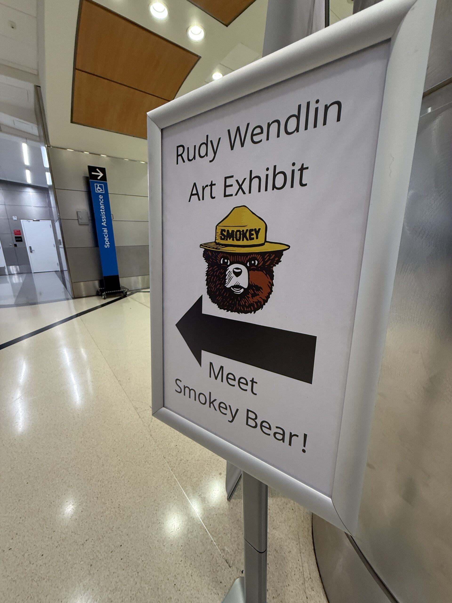 During Fire Prevention Week last October, travelers passing through Hartsfield-Jackson Atlanta International Airport encountered something unexpected: a full art exhibit featuring Rudy Wendelin’s iconic Smokey Bear paintings, staffed by southern state forestry agency personnel answering questions and sharing wildfire prevention tips. Smokey Bear himself made appearances and greeted families and kids. Working alongside the USDA Forest Service Southern Region Fire and Aviation Management and the airport’s art program, SGSF member agencies helped bring Smokey’s timeless message to one of the most diverse audiences in the world.